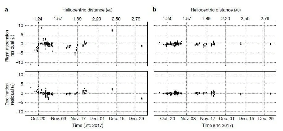 Marco Micheli’s team analyzed the full observational dataset, which includes 177 ground-based and 30 HST based astrometric positions (for a total of 414 scalar measurements), applying the procedures and assumptions discussed in Methods. Their analysis shows that the observed orbital arc cannot be fitted in its entirety by a trajectory governed solely by gravitational forces due to the Sun, the eight planets, the Moon, Pluto, the 16 most massive bodies in the asteroid main belt and relativistic effects14. As shown in diagram D1-a, the residuals in right ascension and declination of the best-fitting gravity-only trajectory are incompatible with the formal uncertainties: ten data points deviate by more than 5σ in at least one coordinate, and 25 are discrepant by more than 3σ. Furthermore, the offsets (as large as 22″ for the 2017 October 14 Catalina observation) are not distributed randomly but show clear trends along the trajectory. (Micheli 1)