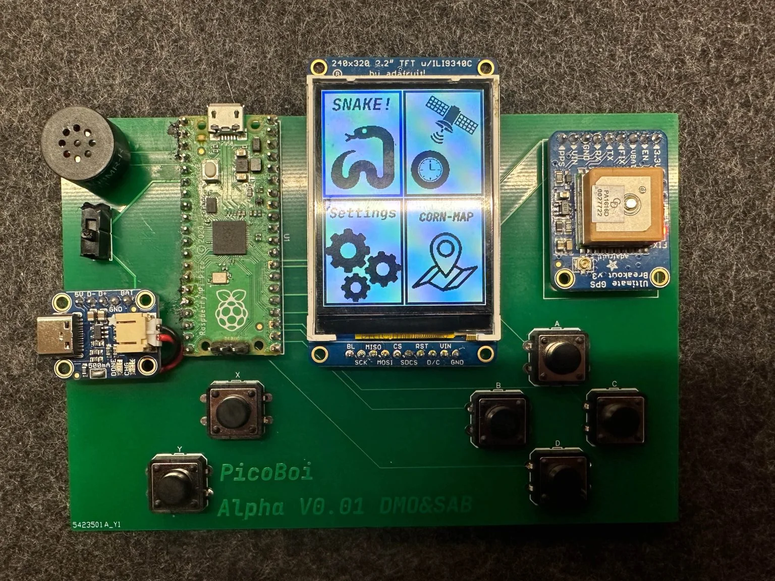 “PicoBoi” is a Gameboy-like device with modern features. Its hardware includes a charging system, speaker, GPS module, button pad, and screen.