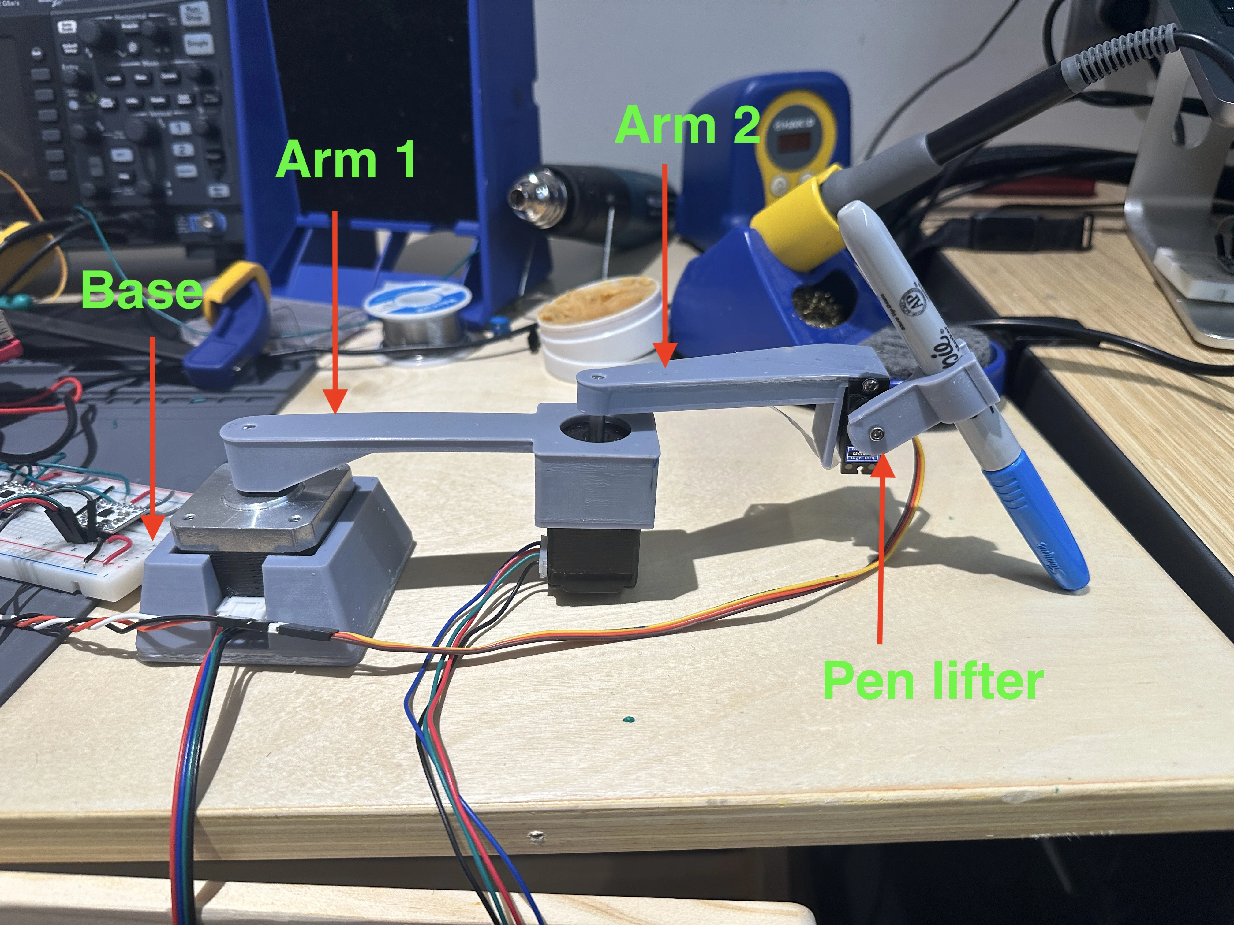 “Tidy Plotter” is a 2-D drawing machine that uses a robotic arm design to reproduce jpeg or png images on flat surfaces. It’s built with 3-D printed arms, two stepper motors, and a servo motor. The software, using OpenCV for image processing, translates the images into a series of points for the plotter to follow.